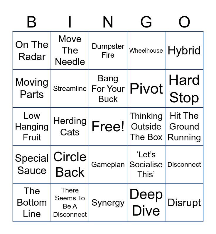 This bingo card has a free space and 42 words: Bandwidth, Bang For Your Buck, Cadence, Circle Back, Deep Dive, Disconnect, Disrupt, Ducks In A Row, Dumpster Fire, Gameplan, Hit The Ground Running, Hard Stop, Herding Cats, Hybrid, Looping In, ‘Let’s Socialise This’, Leverage, Low Hanging Fruit, Mission Critical, Move The Needle, Moving Parts, Northstar, Offload, On The Radar, Optics, Pain Points, Pivot, Proactive, Quick Win, Quiet Quitting, Reinvent The Wheel, Special Sauce, Streamline, Synergy, Take This Offline, The Bottom Line, There Seems To Be A Disconnect, Thinking Outside The Box, Unpack, Up The Ladder, Wheelhouse and Win-Win.