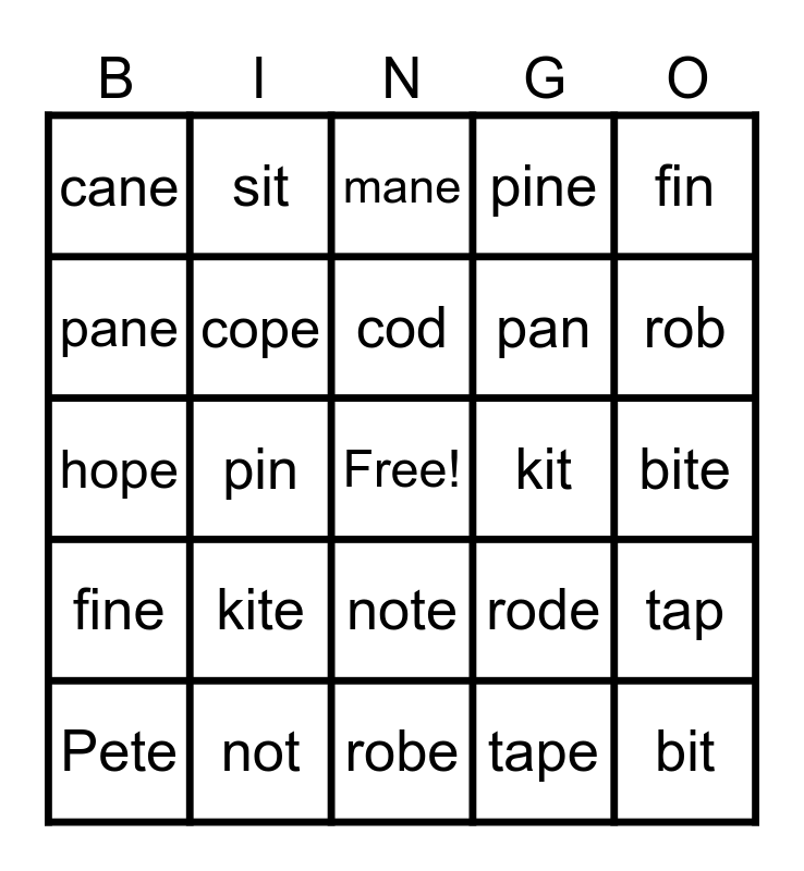 This bingo card has a free space and 40 words: hop, hope, cop, cope, not, note, cod, code, fin, fine, pin, pine, bit, bite, kit, kite, can, cane, man, mane, tap, tape, pan, pane, rat, rate, cut, cute, cub, cube, pet, Pete, rod, rode, rob, robe, Tim, time, sit and site.
