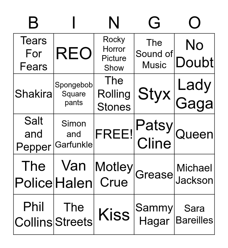 This bingo card has a free space and 24 words: Van Halen, The Streets, The Rolling Stones, Phil Collins, No Doubt, Tears For Fears, Shakira, REO, Patsy Cline, Motley Crue, Styx, Salt and Pepper, Grease, Michael Jackson, Spongebob Square pants, Sammy Hagar, Queen, Rocky Horror Picture Show, Lady Gaga, Simon and Garfunkle, Sara Bareilles, The Police, The Sound of Music and Kiss.