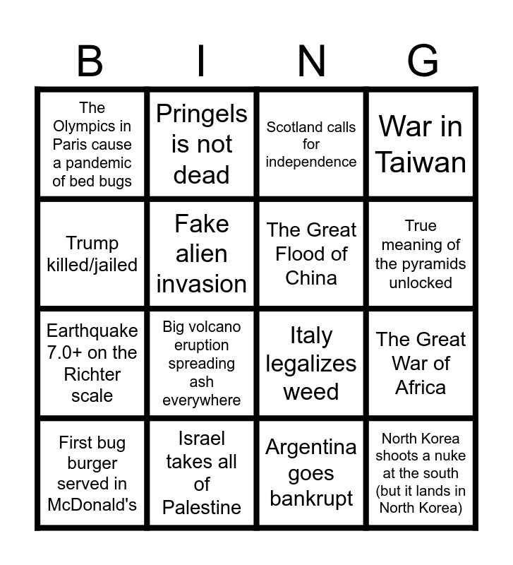 This bingo card has 16 words: Israel takes all of Palestine, The Great War of Africa, Scotland calls for independence, The Olympics in Paris cause a pandemic of bed bugs, Earthquake 7.0+ on the Richter scale, Pringels is not dead, Italy legalizes weed, Argentina goes bankrupt, Trump killed/jailed, Fake alien invasion, First bug burger served in McDonald's, War in Taiwan, Big volcano eruption spreading ash everywhere, True meaning of the pyramids unlocked, The Great Flood of China and North Korea shoots a nuke at the south (but it lands in North Korea).