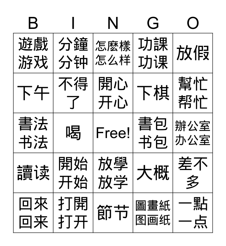 This bingo card has a free space and 24 words: 開始开始, 打開打开, 開心开心, 回來回来, 放假, 遊戲游戏, 下午, 分鐘分钟, 書包书包, 放學放学, 下棋, 書法书法, 大概, 差不多, 不得了, 圖畫紙图画纸, 辦公室办公室, 怎麽樣怎么样, 幫忙帮忙, 喝, 一點一点, 讀读, 功課功课 and 節节.