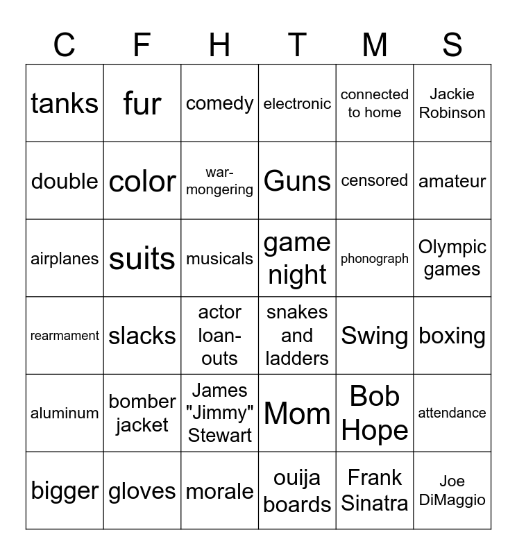 This bingo card has 36 words: rearmament, slacks, morale, Guns, phonograph, Olympic games, tanks, gloves, comedy, Mom, censored, Jackie Robinson, aluminum, suits, war-mongering, electronic, Bob Hope, boxing, double, color, actor loan-outs, snakes and ladders, Swing, attendance, airplanes, fur, musicals, ouija boards, connected to home, amateur, bigger, bomber jacket, James "Jimmy" Stewart, game night, Frank Sinatra and Joe DiMaggio.