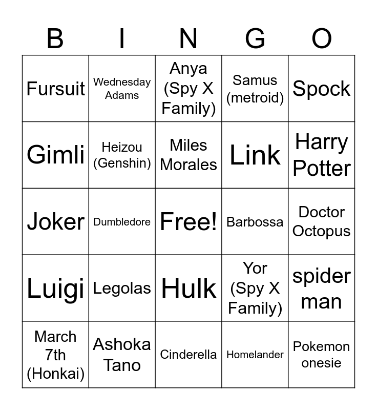 This bingo card has a free space and 87 words: Iron man, black widow, Hulk, Captain america, Hawkeye, Thor, Scarlet witch, Star Lord, Mantis, Wolverine, Deadpool, Storm (X-Men), spider man, Doctor Octopus, Green Goblin, Miles Morales, Superman, Aquaman, Wonder Woman, The Flash, Batman, robin (batman), Joker, Harley Quinn, Homelander, Obi wan kenobi, Palpatine, Darth Vader, Boba Fett, Din Djarin, Ashoka Tano, Random Star Wars alien, Frodo, Legolas, Gimli, Gandalf, Harry Potter, Ron Weasley, Hermione Granger, Dumbledore, Indiana Jones, Jack Sparrow, Davy Jones, Barbossa, Ghostbusters, Spock, Jean-Luc Picard, Wednesday Adams, Eleven (stranger things), The Doctor (Doctor WHO), Barbie, Mario, Luigi, Waluigi, Princess Peach, Rosalina, Link, Zelda, Ganondorf, Samus (metroid), Heizou (Genshin), Lisa (Genshin), Miko (Genshin), Lyney (Genshin), Kafka (Honkai), Himeko (Honkai), Dan Heng (Honkai), March 7th (Honkai), Pokemon onesie, Jessie (Pokémon), James (Pokémon), Luffy (one piece), Anya (Spy X Family), Yor (Spy X Family), Hatsune Miku, Ladybug (miraculous), Heinz Doofenshmirtz, Cinderella, Belle, Elsa, Lilo (lilo & stitch), Maleficent, Fred (scooby doo), Daphne (scooby doo), Robot/mech suit, Fursuit and Jezus.