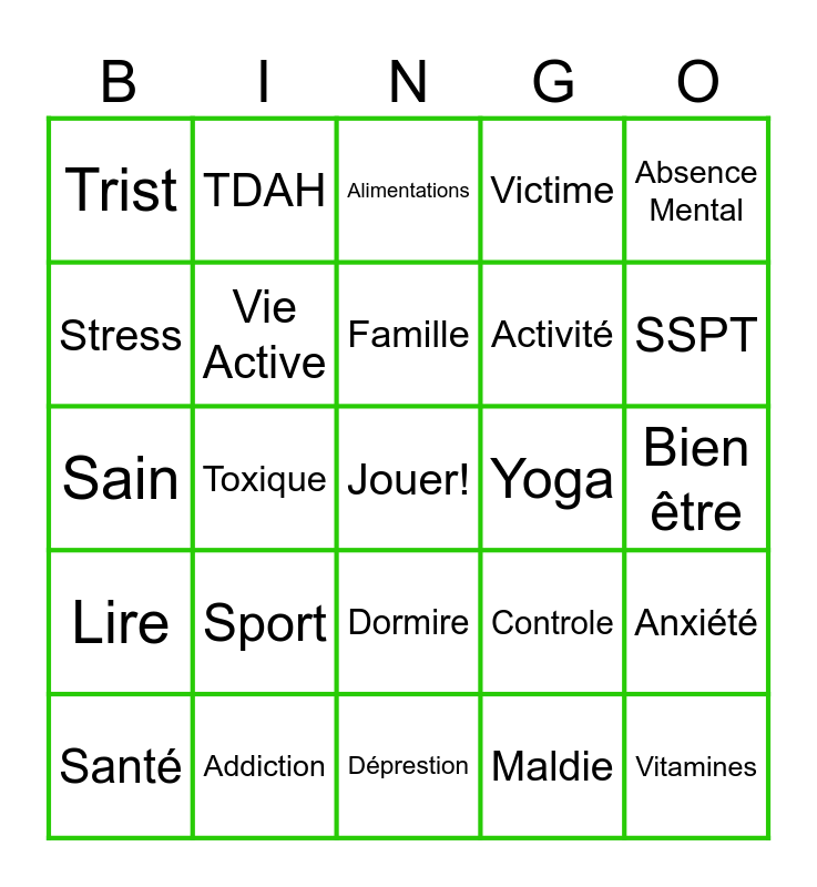 This bingo card has a free space and 24 words: Santé, Sport, Famille, Maldie, Absence Mental, Trist, TDAH, Alimentations, Yoga, Bien être, Sain, Vie Active, Controle, Anxiété, Stress, Addiction, Déprestion, Victime, SSPT, Lire, Toxique, Dormire, Activité and Vitamines.