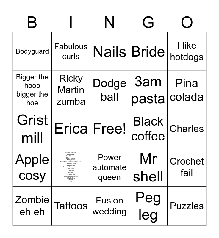 This bingo card has a free space and 25 words: Fusion wedding Dodge ball Zombie eh eh I like hotdogs Bodyguard Bigger the hoop bigger the hoe Fabulous curls Black coffee Power automate queen 3am pasta Grist mill Mr shell Crochet fail Ricky Martin zumba IOW festival Charles Nai, Fusion wedding, Dodge ball, Zombie eh eh, I like hotdogs, Bodyguard, Bigger the hoop bigger the hoe, Fabulous curls, Black coffee, Power automate queen, 3am pasta, Grist mill, Mr shell, Crochet fail, Ricky Martin zumba, IOW festival, Charles, Nails, Pina colada, Erica, Puzzles, Tattoos, Apple cosy, Bride and Peg leg.