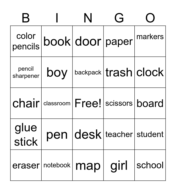 This bingo card has a free space and 24 words: pen, notebook, backpack, eraser, markers, color pencils, pencil sharpener, book, scissors, desk, trash, chair, teacher, student, boy, girl, board, door, clock, classroom, school, glue stick, paper and map.