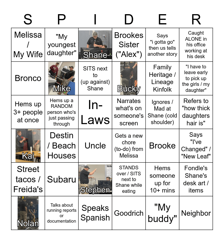 This bingo card has 8 images and 56 words: Cousin, Uncle, Deddie (Daddy), Melissa / My Wife, Brooke, Caught telling 5 stories about other peoples experiences (vicarious), Bronco, Enters the maintenance office 5+ times, SITS next to (up against) Shane, Shows someone multiple videos / photos (2+), Brookes Sister ("Alex"), Neighbor, Hems someone up for 10+ mins, STANDS over / SITS next to Shane while eating, Says "My Daughter(s)", Fondle's Shane's desk art / items, Says "i gotta go" then us tells another story, "I have to leave early to pick up the girls / my daughter", Leaves something in our office (trash/phone), Hems up 3+ people at once, Hems up a RANDOM person who's just passing through, Nolan, Kai, Shane, Brian, Mike, Stephen, Josh, Bucky, Talks about running reports or documentation, Sits in Brian's Chair, "My buddy", Does the "Hubbard Lean", Talks about "getting work done / being busy", In-Laws, Caught ALONE in his office working at his desk, Family Heritage / Lineage Kinfolk, Stands Over Shane, Narrates what's on someone's screen, "My youngest daughter", Refers to "how thick daughters hair is", Street tacos / Freida's, "my oldest daughter", Refers to a FUN activity that HE did, One-Up's someone else's story, Ignores / Mad at Shane (cold shoulder), Gets a new chore (to-do) from Melissa, Green Tea, Goodrich, Subaru, Says "I've Changed" / "New Leaf", Speaks Spanish, Tells a story about being in trouble with Melissa, Duncanville, Destin / Beach Houses and Starts Singing / Humming.