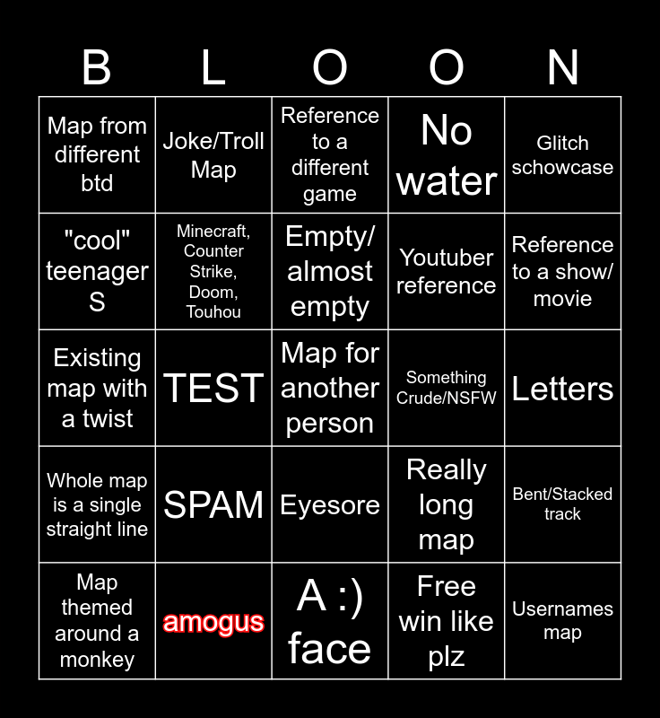 This bingo card has 30 words: amogus, Really short map, TEST, Gimmick, Map from different btd, Reference to a different game, Minecraft, Counter Strike, Doom, Touhou, Eyesore, Something Crude/NSFW, A :) face, Letters, Map for another person, Free win like plz, Usernames map, Reference to a show/ movie, Different launguage, Really long map, Whole map is a single straight line, SPAM, Glitch schowcase, Existing map with a twist, Puzzle, Joke/Troll Map, Youtuber reference, "cool" teenager S, No water, Bent/Stacked track, Map themed around a monkey, Empty/ almost empty and 3D.