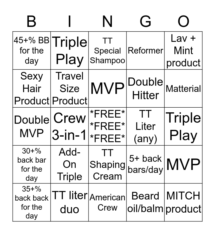 This bingo card has a free space and 24 words: Add-On Triple, TT liter duo, MVP, 35+% back back for the day, Lav + Mint product, 45+% BB for the day, Sexy Hair Product, Triple Play, TT Liter (any), TT Shaping Cream, Double Hitter, Double MVP, 5+ back bars/day, MVP, Travel Size Product, Beard oil/balm, Triple Play, TT Special Shampoo, Matterial, Crew 3-in-1, MITCH product, 30+% back bar for the day, Reformer and American Crew.