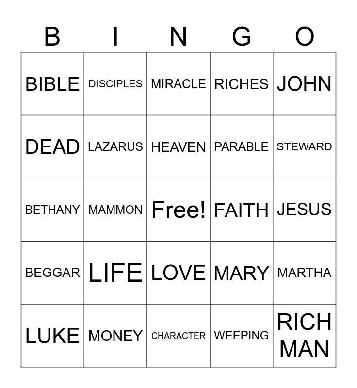 This bingo card has a free space and 24 words: LIFE, MONEY, HEAVEN, LUKE, JOHN, BIBLE, DEAD, DISCIPLES, FAITH, LOVE, PARABLE, BETHANY, MARY, MARTHA, LAZARUS, WEEPING, JESUS, MIRACLE, STEWARD, MAMMON, RICH MAN, BEGGAR, RICHES and CHARACTER.