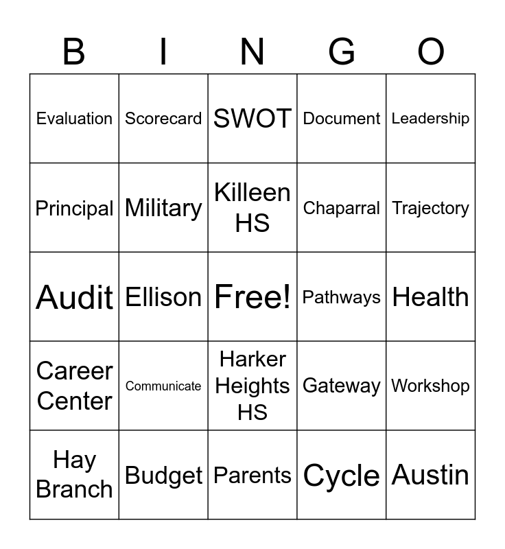 This bingo card has a free space and 69 words: Teachers, Health, Safety, KISD Police, Budget, Modality, Document, Security, Leadership, Holdsworth, Workshop, Outcomes, Evaluation, SWOT, Discipline, Ellison, Harker Heights HS, Chaparral, Shoemaker, Career Center, Pathways, Gateway, Trajectory, Accountability, Vapes, DAEP, Babies, Highway 195, Cycle, HPMS, Scorecard, Senior Staff, Growth, Board of Trustees, Football, Senior, Arrows, Students, Principal, Professional Development, Communicate, Austin, Cedar Valley, Own the Work, Advisory Councils, Hay Branch, Iduma, Willow Springs, Survey, Military, Killeen HS, Integrate, Texas, Parents, Language, Vouchers, Voice, Restorative Practices, Gibson, Audit, Canva, Attendance, Bus, Cafeteria, Diversity, Community, Strength, Partnerships and Fort Cavazos.