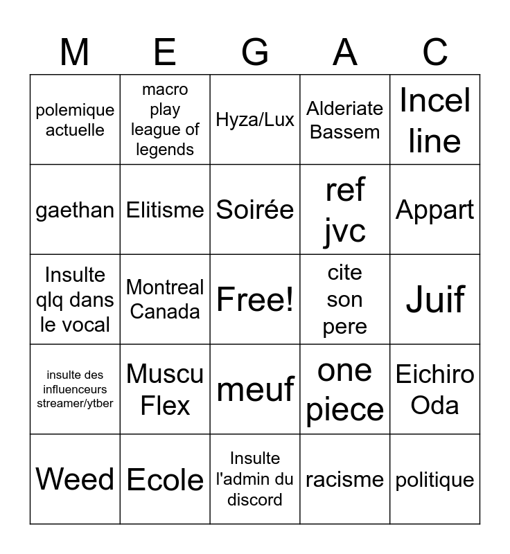 This bingo card has a free space and 24 words: Muscu Flex, Ecole, Soirée, Weed, Incel line, polemique actuelle, gaethan, macro play league of legends, cite son pere, meuf, ref jvc, Insulte qlq dans le vocal, one piece, Eichiro Oda, Elitisme, racisme, Juif, Hyza/Lux, Appart, Montreal Canada, politique, insulte des influenceurs streamer/ytber, Alderiate Bassem and Insulte l'admin du discord.