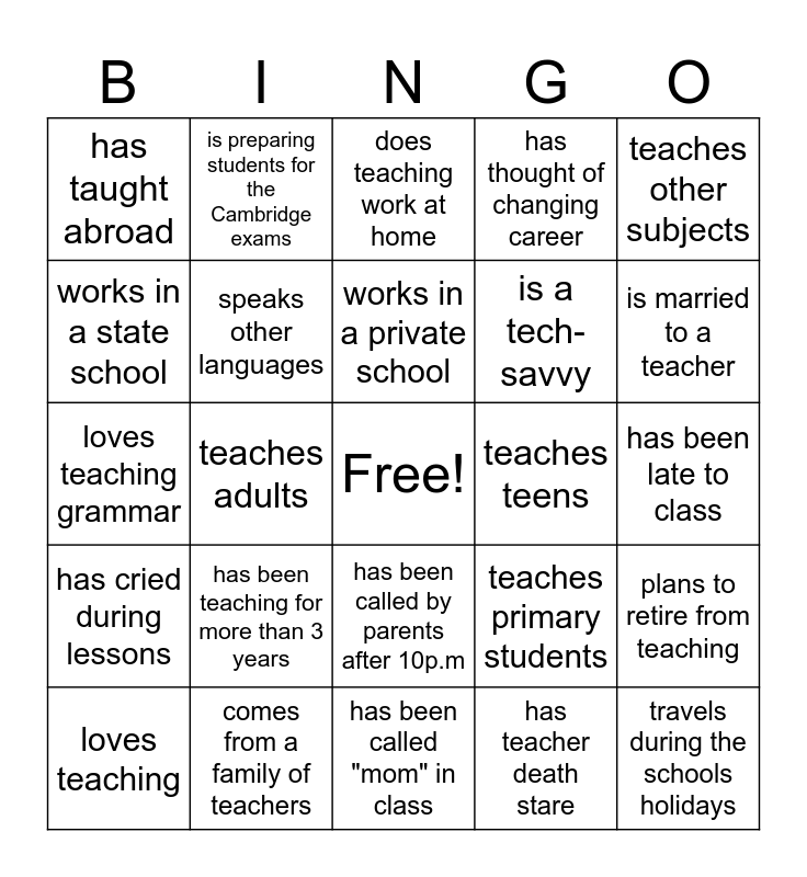 This bingo card has a free space and 25 words: has been teaching for more than 3 years, has been called "mom" in class, works in a private school, loves teaching, teaches other subjects, has taught abroad, works in a state school, is preparing students for the Cambridge exams, teaches teens, has been called by parents after 10p.m, is a tech-savvy, loves teaching grammar, teaches primary students, plans to retire from teaching, speaks other languages, is happy to be here, has been late to class, does teaching work at home, is married to a teacher, teaches adults, travels during the schools holidays, comes from a family of teachers, has cried during lessons, has thought of changing career and has teacher death stare.