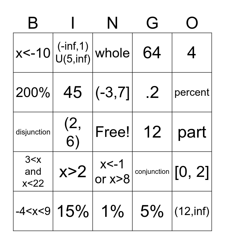 This bingo card has a free space and 24 words: x>2, 15%, (-3,7], -4<x<9, 4, x<-10, 200%, (-inf,1) U(5,inf), 12, x<-1 or x>8, .2, disjunction, conjunction, [0, 2], 45, 5%, part, whole, percent, (2, 6), (12,inf), 3<x and x<22, 64 and 1%.