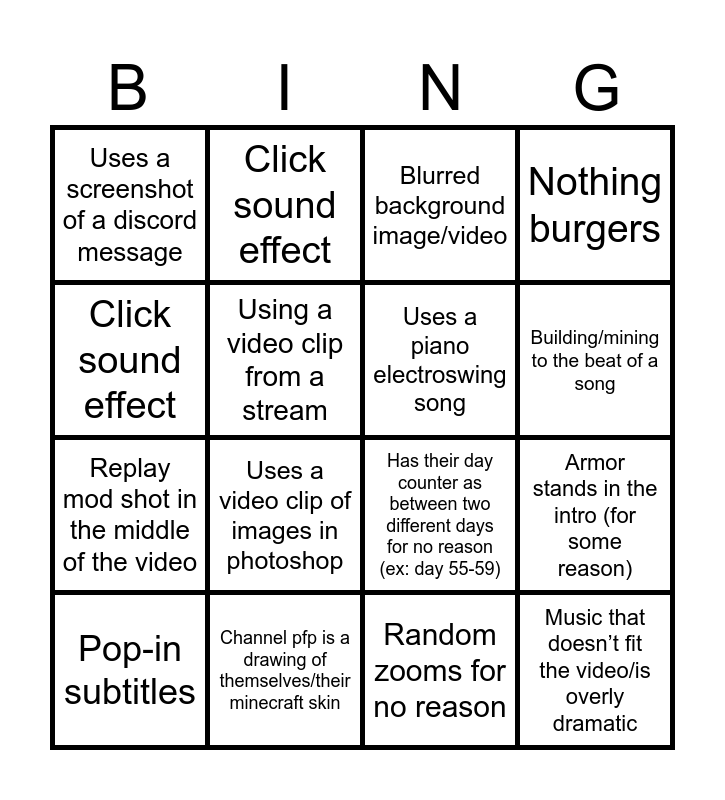 ⚠ This card has duplicate items: Replay mod shot in intro (2), Pop-in subtitles (2), Blurred background image/video (2), Whoosh sound effect (2), Basically (if not) yelling (2), Fast cuts between breaking/placing blocks (2), Fast cuts between killing animals/mobs (2), Way too fast-paced (2), Random subtitles in the middle of the video (2), Image of an inventory interface (2), White subtitles with black outline (2), Cuts between sentences (2), Summary/plot of the episode in the intro (2), Animated intro (2), Uses a screenshot of a discord message (2), Click sound effect (2), Hardcore series (2), Smp video (2), Image of heart/hunger bars (2), Music that doesn’t fit the video/is overly dramatic (2), Uses fake players (2), Replay mod shot in the middle of the video (2), Using a video clip from a stream (2), Using a video clip from a different player (2), Image of the Minecraft logo (2), Building/mining to the beat of a song (2), Uses a piano electroswing song (2), Uses a minecraft sound effect for transitions/images (2), Any kind of suspense sound effect (2), Channel pfp is a poorly drawn face (2), Channel pfp is a drawing of themselves/their minecraft skin (2), “Grabs some snacks, relax, and enjoy” (2), Calls their video a movie (2), Armor stands in the intro (for some reason) (2), Has their day counter as between two different days for no reason (ex: day 55-59) (2), Uses a knockoff minecraft font (2), Their minecraft character in f5 while talking (2), They have to defeat their “biggest enemy” or the “most deadly player” on the server (2), Random zooms for no reason (2), Has a totem texture that is their skin (2), Uses a video clip of images in photoshop (2), Nothing burgers (2), Has a speech impediment (2), Has x amount of time to complete their goal (2), “Consider subscribing it helps alot” or “its free and you can unsub” (2), Among us sound effects (2), Vine sound effects (2), Stops the music/video flow to say something out of character (2), Theyre british (2)