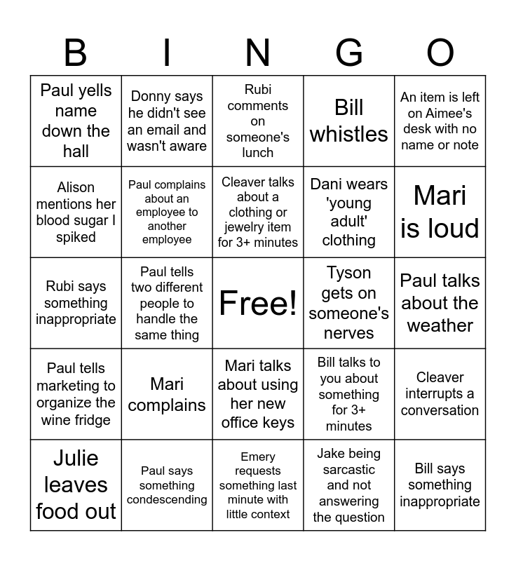 This bingo card has a free space and 24 words: Mari complains, Paul says something condescending, Cleaver talks about a clothing or jewelry item for 3+ minutes, Julie leaves food out, An item is left on Aimee's desk with no name or note, Paul yells name down the hall, Alison mentions her blood sugar I spiked, Donny says he didn't see an email and wasn't aware, Tyson gets on someone's nerves, Mari talks about using her new office keys, Dani wears 'young adult' clothing, Rubi says something inappropriate, Bill talks to you about something for 3+ minutes, Cleaver interrupts a conversation, Paul complains about an employee to another employee, Jake being sarcastic and not answering the question, Paul talks about the weather, Rubi comments on someone's lunch, Mari is loud, Paul tells two different people to handle the same thing, Bill says something inappropriate, Paul tells marketing to organize the wine fridge, Bill whistles and Emery requests something last minute with little context.
