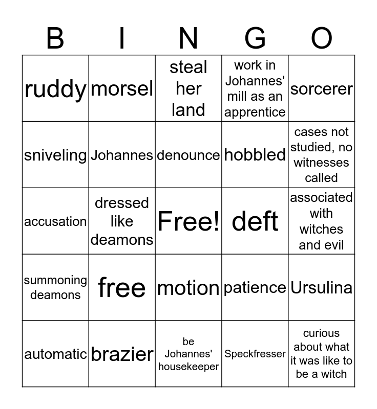 This bingo card has a free space and 24 words: free, brazier, denounce, automatic, sorcerer, ruddy, sniveling, morsel, deft, motion, hobbled, accusation, patience, Ursulina, Johannes, Speckfresser, associated with witches and evil, steal her land, cases not studied, no witnesses called, dressed like deamons, curious about what it was like to be a witch, summoning deamons, work in Johannes' mill as an apprentice and be Johannes' housekeeper.