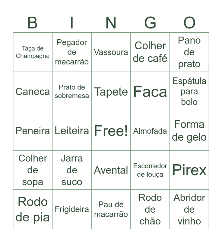 This bingo card has a free space and 62 words: Panela de pressão, Frigideira, Colher de pau, Colher de sopa, Prato raso, Prato fundo, Prato de sobremesa, Garfo, Faca, Colher de sopa, Colher de café, Xícara, Caneca, Copo, Taça de Vinho, Taça de Champagne, Abridor de vinho, Pano de prato, Guardanapo, Tapete, Almofada, Vassoura, Rodo de pia, Rodo de chão, Pano de chão, Ferro de passar, Ralador, Fruteira, Pirex, Assadeira, Tupperwear, Saleiro, Balde, Tábua de corte, Forma de gelo, Pegador de macarrão, Pegador sorvete, Prendedor de roupa, Leiteira, Coador, Peneira, Garrafa de café, Jarra de suco, Cortador de pizza, Espátula para bolo, Escorredor de louça, Medidores, Potes, Espremedor de limão, Copo de shot, Avental, Pau de macarrão, Forma de pizza, Pá de lixo, Abridor de lata, Luva térmica, Balança, Escada, Lixeira, Cesto de roupa, Jogo de toalha and Jogo de cama.