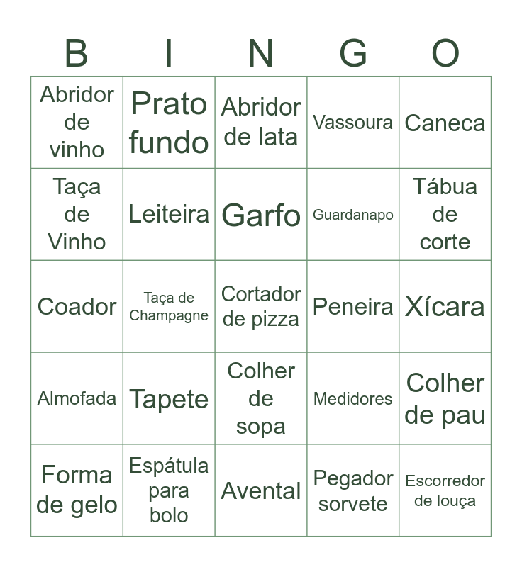 This bingo card has 63 words: Free!, Panela de pressão, Frigideira, Colher de pau, Colher de sopa, Prato raso, Prato fundo, Prato de sobremesa, Garfo, Faca, Colher de sopa, Colher de café, Xícara, Caneca, Copo, Taça de Vinho, Taça de Champagne, Abridor de vinho, Pano de prato, Guardanapo, Tapete, Almofada, Vassoura, Rodo de pia, Rodo de chão, Pano de chão, Ferro de passar, Ralador, Fruteira, Pirex, Assadeira, Tupperwear, Saleiro, Balde, Tábua de corte, Forma de gelo, Pegador de macarrão, Pegador sorvete, Prendedor de roupa, Leiteira, Coador, Peneira, Garrafa de café, Jarra de suco, Cortador de pizza, Espátula para bolo, Escorredor de louça, Medidores, Potes, Espremedor de limão, Copo de shot, Avental, Pau de macarrão, Forma de pizza, Pá de lixo, Abridor de lata, Luva térmica, Balança, Escada, Lixeira, Cesto de roupa, Jogo de toalha and Jogo de cama.