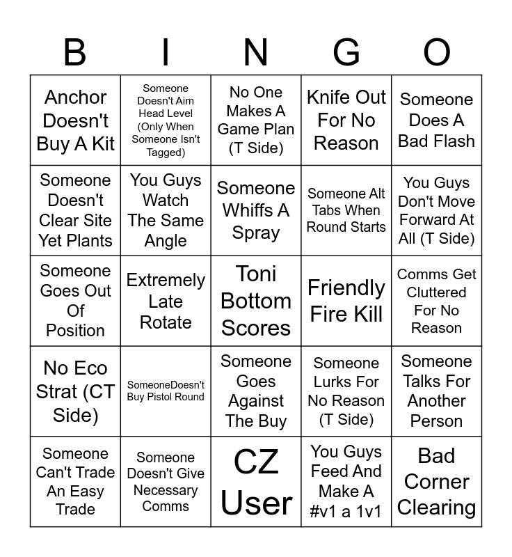 This bingo card has a free space and 24 words: SomeoneDoesn't Buy Pistol Round, Someone Doesn't Give Necessary Comms, Someone Whiffs A Spray, Someone Can't Trade An Easy Trade, Someone Does A Bad Flash, Anchor Doesn't Buy A Kit, Someone Doesn't Clear Site Yet Plants, Someone Doesn't Aim Head Level (Only When Someone Isn't Tagged), Friendly Fire Kill, Someone Goes Against The Buy, Someone Alt Tabs When Round Starts, Someone Goes Out Of Position, Someone Lurks For No Reason (T Side), Someone Talks For Another Person, You Guys Watch The Same Angle, You Guys Feed And Make A #v1 a 1v1, Comms Get Cluttered For No Reason, No One Makes A Game Plan (T Side), You Guys Don't Move Forward At All (T Side), Extremely Late Rotate, Bad Corner Clearing, No Eco Strat (CT Side), Knife Out For No Reason and CZ User.