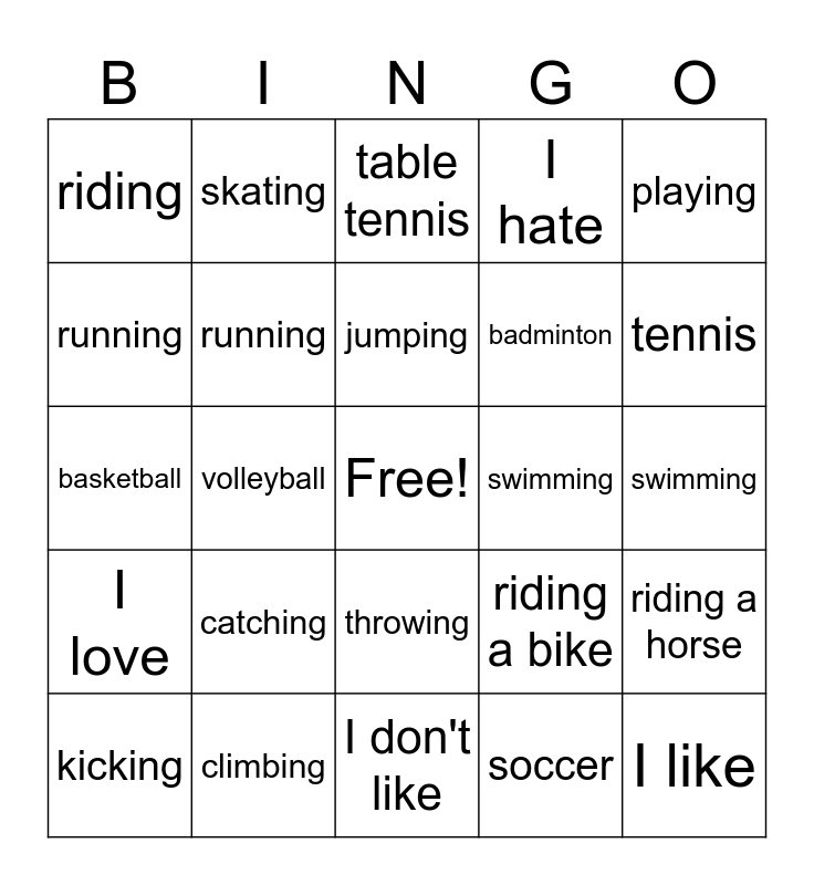 This bingo card has a free space and 24 words: catching, climbing, jumping, kicking, playing, riding, running, skating, swimming, throwing, badminton, basketball, riding a bike, riding a horse, running, soccer, swimming, table tennis, tennis, volleyball, I like, I love, I hate and I don't like.