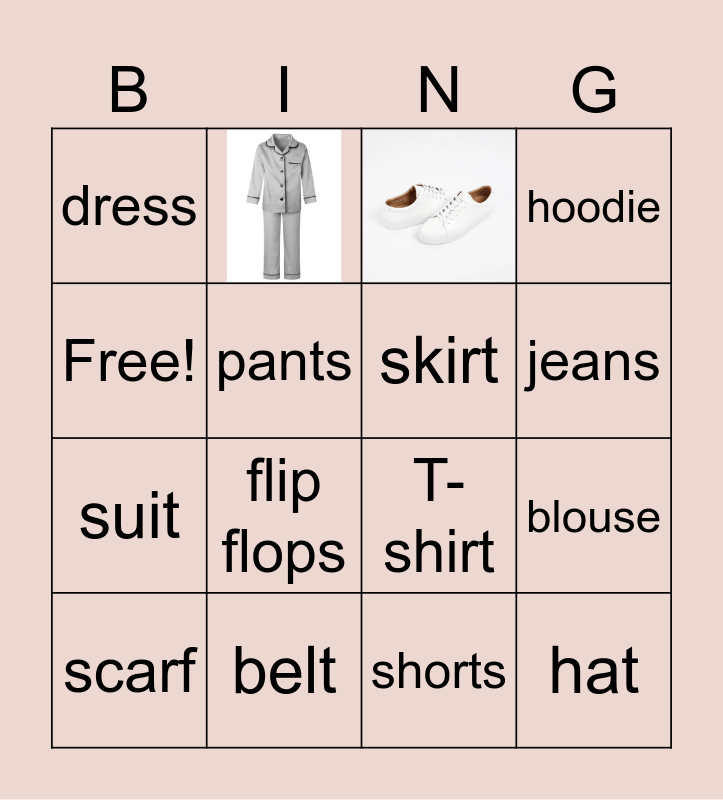 This bingo card has 2 images and 14 words: belt, blouse, dress, suit, T-shirt, shorts, Free!, pants, scarf, hoodie, flip flops, jeans, skirt and hat.