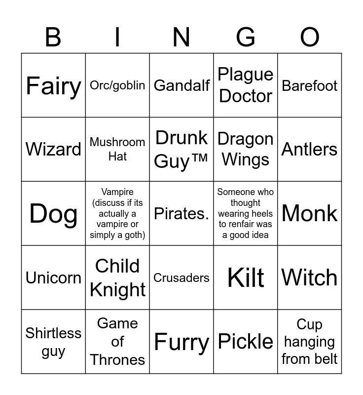 This bingo card has a free space and 47 words: Monty Python, Cup hanging from belt, Face paint, Furry, Child Knight, Legend of Zelda Shield, Orc/goblin, Parasol, Wizard, Jack Sparrow (specifically), Mushroom Hat, Plague Doctor, Witch, Kilt, Mermaid (or vaguely mermaid themed), Harry Potter, Drunk Guy™, Someone who thought wearing heels to renfair was a good idea, Musical Insturment, Barefoot, Vampire (discuss if its actually a vampire or simply a goth), Pickle, Fairy, Dragon Wings, Assassins Creed, Antlers, Shirtless guy, Puppet, Crusaders, Unicorn, Steampunk, Greek/Roman, Turkey Leg, Crying Baby, Fur Clothing, Game of Thrones, Monk, Jester, Flower Crown, Witcher, Horns (not antlers), Gandalf, Dog, Pajamas, Corset, Princess and Superhero.