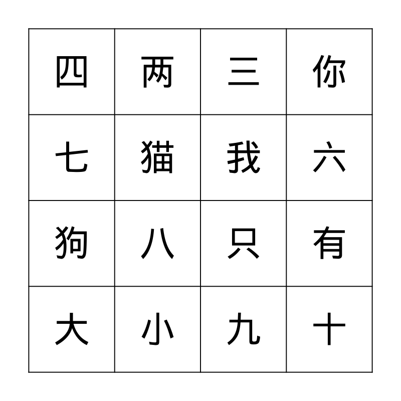 This bingo card has a free space and 15 words: 大, 十, 三, 四, 六, 七, 八, 九, 猫, 狗, 有, 你, 我, 两 and 小.