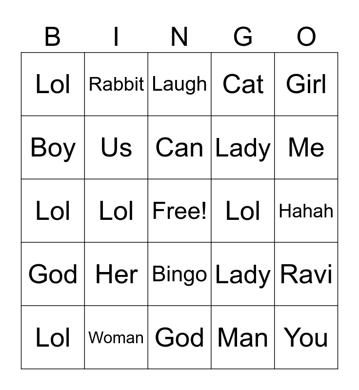 This bingo card has a free space and 29 words: Lol, Have a, Lol, Lol, Lol, Laugh, Us, Her, Lol, Woman, Hahah, You, God, Man, Me, Father, Bingo, God, Girl, Lol, Lady, Lol, Lady, Boy, Cat, Rabbit, Ravi, Can and Tomatoe.