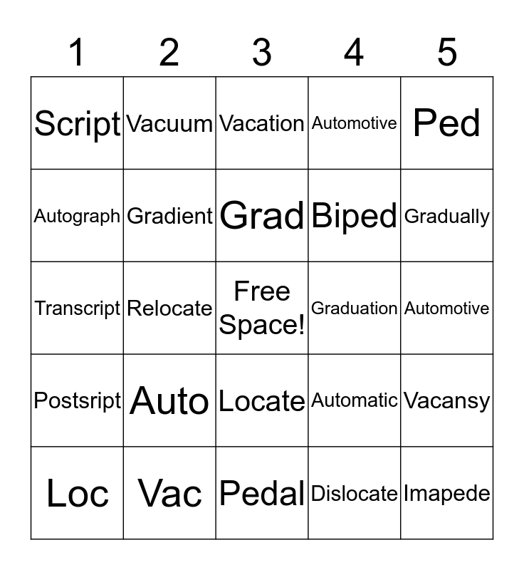 This bingo card has a free space and 24 words: Auto, Vac, Grad, Loc, Ped, Script, Autograph, Vacuum, Graduation, Locate, Biped, Transcript, Automatic, Vacansy, Gradient, Dislocate, Automotive, Vacation, Gradually, Relocate, Imapede, Postsript, Automotive and Pedal.