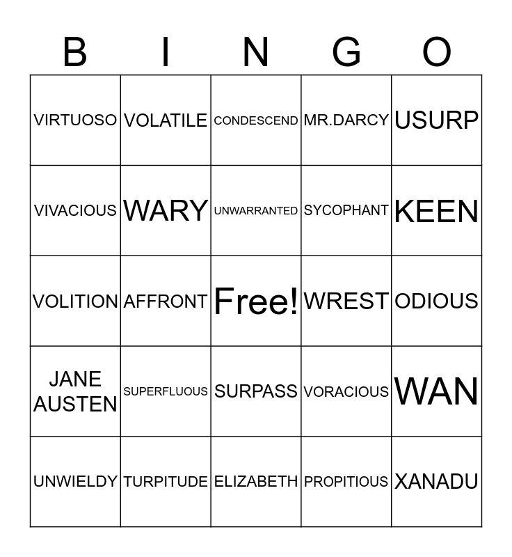 This bingo card has a free space and 24 words: SUPERFLUOUS, TURPITUDE, UNWARRANTED, UNWIELDY, USURP, VIRTUOSO, VIVACIOUS, VOLATILE, WREST, SURPASS, SYCOPHANT, VOLITION, VORACIOUS, WAN, WARY, PROPITIOUS, ODIOUS, CONDESCEND, KEEN, AFFRONT, XANADU, JANE AUSTEN, MR.DARCY and ELIZABETH.
