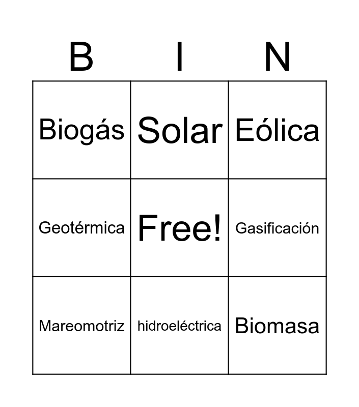 This bingo card has a free space and 10 words: hidroeléctrica, Eólica, Biogás, Biomasa, Geotérmica, Mareomotriz, Solar, Energía de algas, Gasificación and Piezoeléctrica.