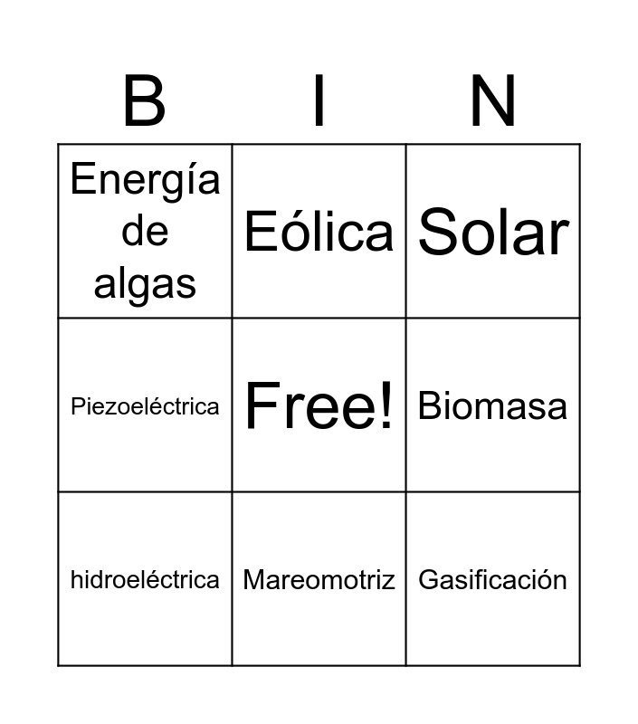 This bingo card has a free space and 10 words: Mareomotriz, Solar, Energía de algas, Gasificación, Piezoeléctrica, hidroeléctrica, Eólica, Biogás, Biomasa and Geotérmica.