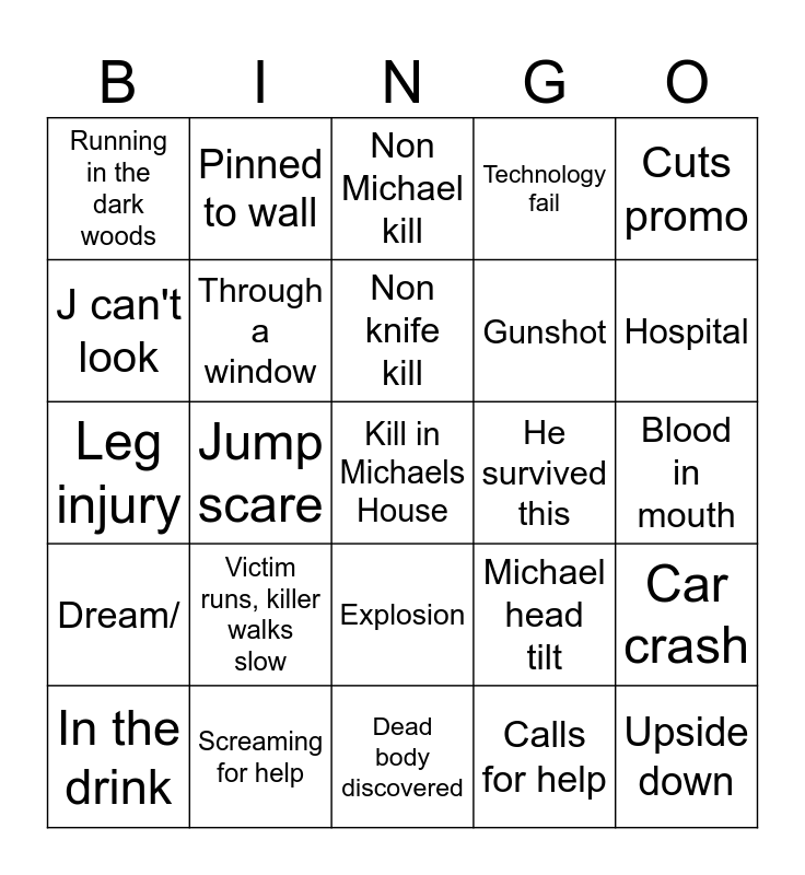 This bingo card has 25 words: Victim runs, killer walks slow, Dead body discovered, Non knife kill, In the drink, Cuts promo, Running in the dark woods, J can't look, Pinned to wall, He survived this, Explosion, Gunshot, Leg injury, Michael head tilt, Car crash, Through a window, Upside down, Blood in mouth, Non Michael kill, Hospital, Jump scare, Kill in Michaels House, Screaming for help, Dream/, Technology fail and Calls for help.