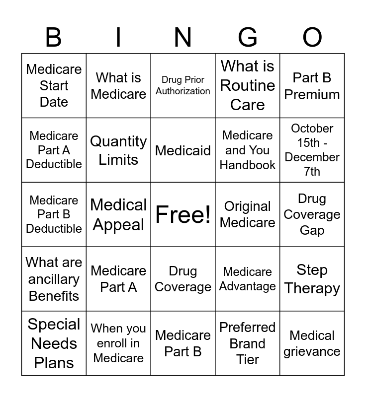 This bingo card has a free space and 25 words: Medicare Part A, Medicare Part B, Medicaid, Special Needs Plans, Part B Premium, Medicare Start Date, Medicare Part A Deductible, What is Medicare, Original Medicare, Drug Coverage, Medicare and You Handbook, Medicare Part B Deductible, Medicare Advantage, Step Therapy, Quantity Limits, Drug Exception, Drug Coverage Gap, Drug Prior Authorization, October 15th -December 7th, Medical Appeal, Medical grievance, When you enroll in Medicare, What are ancillary Benefits, What is Routine Care and Preferred Brand Tier.