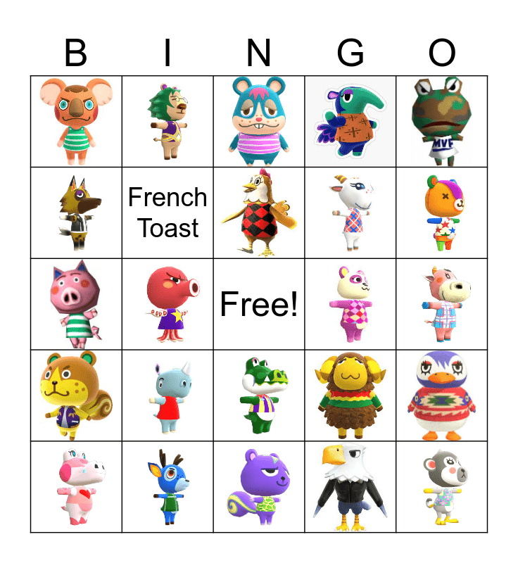 This bingo card has 24 images, a free space and 2 words: French Toast and Mac.