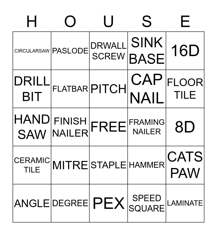 This bingo card has a free space and 24 words: MITRE, DEGREE, PITCH, ANGLE, 16D, CIRCULARSAW, DRILL BIT, PASLODE, FRAMING NAILER, STAPLE, CAP NAIL, HAND SAW, HAMMER, CATS PAW, FLATBAR, SPEED SQUARE, 8D, DRWALL SCREW, FLOOR TILE, FINISH NAILER, LAMINATE, CERAMIC TILE, SINK BASE and PEX.