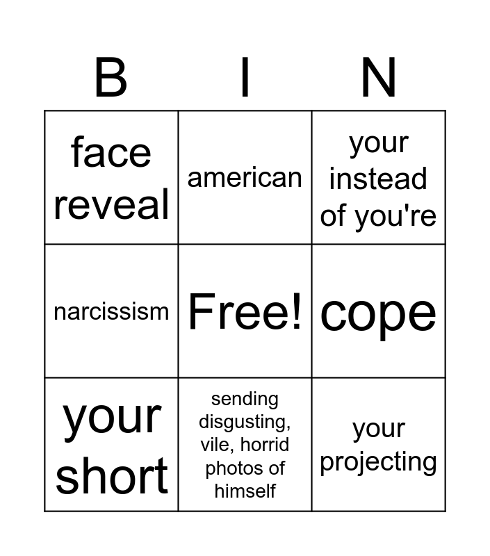 This bingo card has a free space and 8 words: cope, your instead of you're, american, your short, face reveal, your projecting, narcissism and sending disgusting, vile, horrid photos of himself.