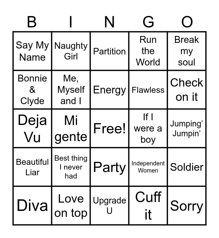 This bingo card has a free space and 44 words: Hold up, Sorry, Drunk in love, Diva, Halo, Cuff it, Partition, 7/11, Break my soul, Love on top, Run the World, If I were a boy, Party, Best thing I never had, Irreplaceable, Upgrade U, Get me Bodied, Deja Vu, Single Ladies, Check on it, Naughty Girl, Baby Boy, Apeshit, Say My Name, Survivor, Jumping’ Jumpin’, Lose my Breath, Bills, bills, bills, Independent Women, Beautiful Liar, Bootylicious, Soldier, Bug a boo, Telephone, Mi gente, Virgo’s groove, Freedom, Freaky Dress, Energy, Bonnie & Clyde, Flawless, End of time, Me, Myself and I and Pretty Hurts.