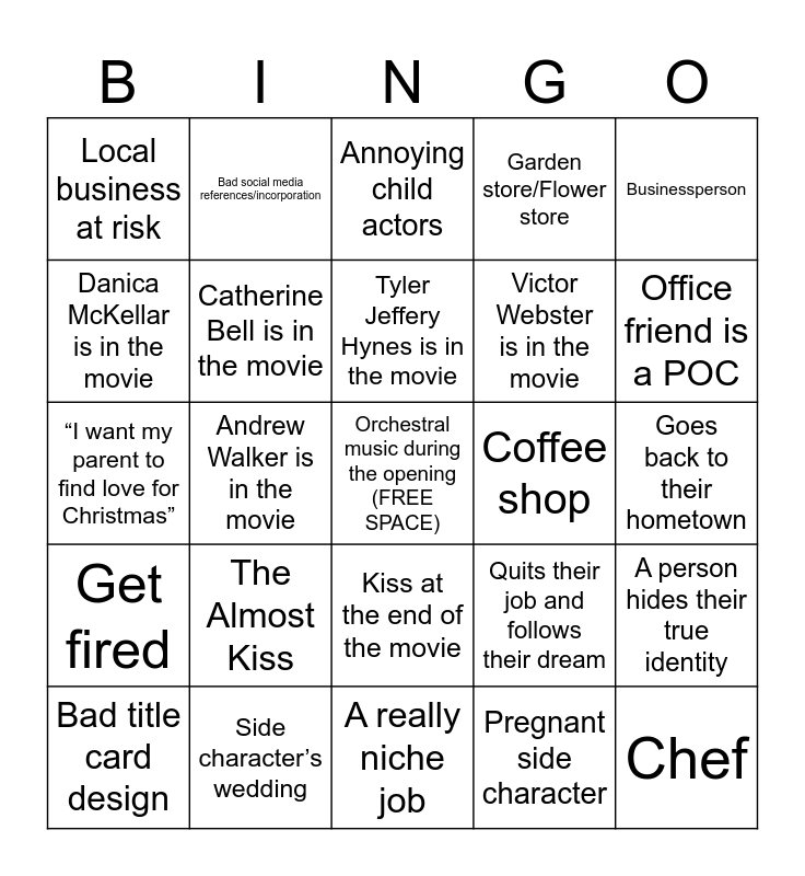 This bingo card has a free space and 44 words: Journalist, Chef, “Let me explain!”, Bad title card design, Lost item, Pregnant side character, Annoying child actors, Ex Lovers, Businessperson, Side character’s wedding, Garden store/Flower store, Coffee shop, Kiss at the end of the movie, The Almost Kiss, Wearing inappropriate clothing for the weather, A really niche job, Bad boyfriend visits the main lady, “I want my parent to find love for Christmas”, MC cheats on their partner but it isn’t addressed at all, Office friend is a POC, Bad social media references/incorporation, Living in a massive house/apartment, Bad first encounter, Local business at risk, Break up at the beginning of the movie, Goes back to their hometown, Goes to a small town, A gay couple is included, Quits their job and follows their dream, Get fired, Kids play matchmaker, A person hides their true identity, Cozy inn, Alison Sweeney is in this movie, Andrew Walker is in the movie, Lacey Chabert is in the movie, Luke Macfarlane is in the movie, Mark Rosener is in the movie, Tyler Jeffery Hynes is in the movie, Danica McKellar is in the movie, Victor Webster is in the movie, Ryan Jacob Paevey-Vlieger is in the movie, Catherine Bell is in the movie and Baliee Madison is in this movie.
