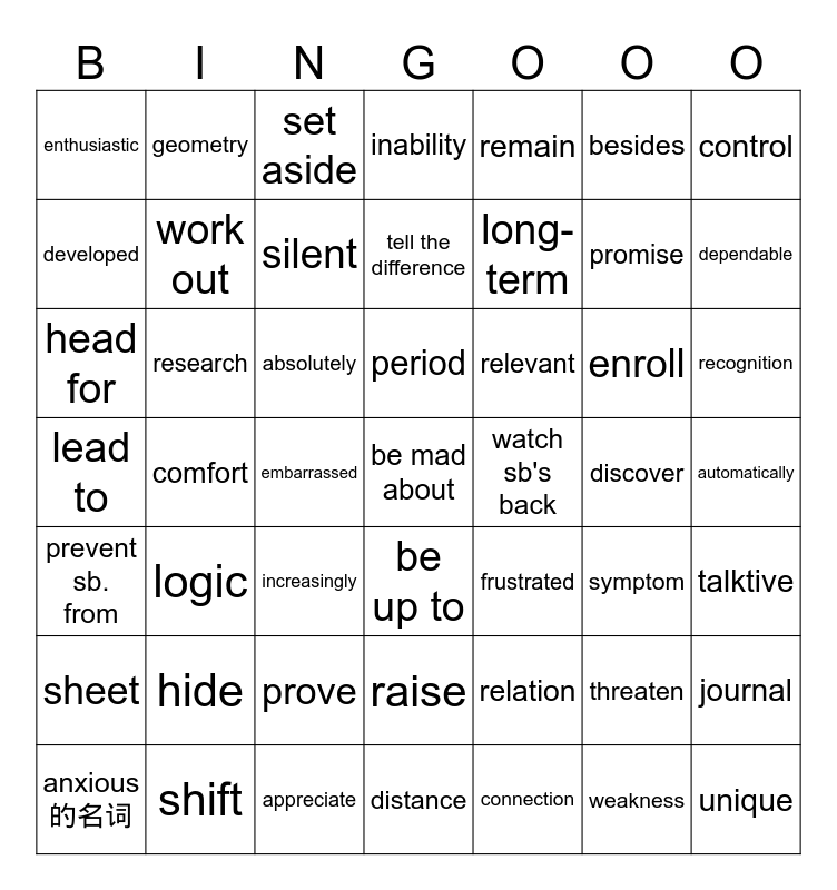 This bingo card has a free space and 97 words: unbelievably, get through, prevent sb. from, long-term, support, signal, conduct, out of a job, be longing to do, display, effect, cancel, relation, research, be addicted to, enthusiastic, remain, shift, cause, connection, test, distance, sheet, flexible, be up to, developed, recognition, enroll, task, respectful, control, inability, weakness, prove, comfort, period, frustrated, proper, automatically, tell the difference, journal, head for, symptom, embarrassed, absolutely, unique, purpose, depend on, be ready to, newness, target, watch sb's back, threaten, be prepared for, put ... in order, watch out for, talktive, geometry, stress, logic, increasingly, struggle, as usual, make it, hand in, praise, catch up on, appreciate, add to, lead to, work out, point out, raise, repeat, fail, hide, examine, describe, dependable, disturb, discover, silent, order, invitation, step, freedom, promise, proess, begin的名词形式, a way to do, set aside, basic, facility, relevant, besides, anxious的名词 and curious的名词.