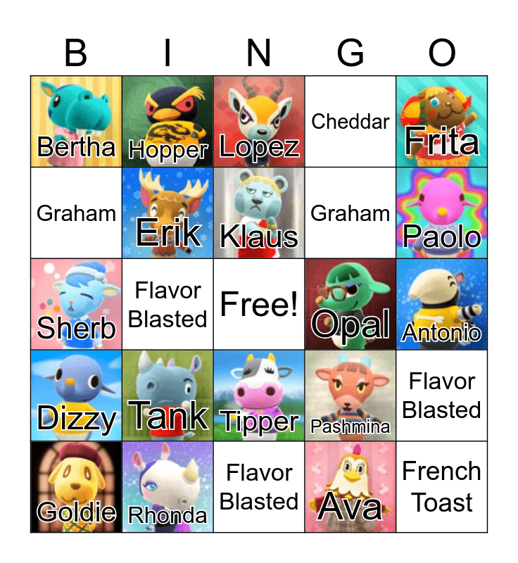 This bingo card has 24 images, a free space and 34 words: Ankha, Ava, Biff, Cleo, Dizzy, Erik, Frita, Goldie, Hopper, Julia, Klaus, Lopez, Maple, Naomi, Opal, Paolo, Rhonda, Sherb, Tank, Pashmina, Tipper, Apollo, Bertha, Antonio, Flavor Blasted, French Toast, Cheddar, Graham, Graham, Graham, Mac, Flavor Blasted, Flavor Blasted and Flavor Blasted.