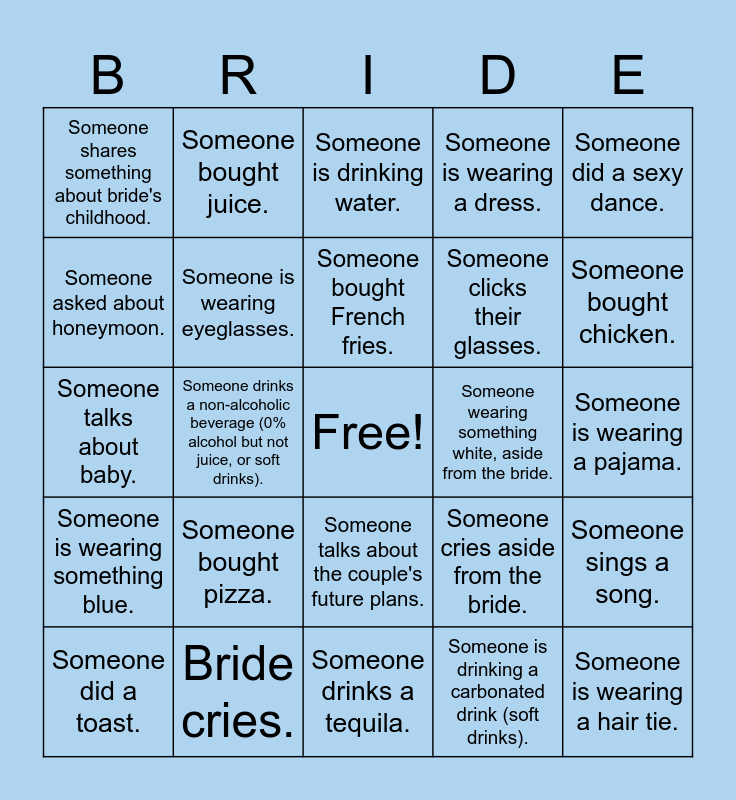 This bingo card has a free space and 27 words: Someone cries aside from the bride., Someone wears something pink., Someone clicks their glasses., Someone drinks a tequila., Someone asked about honeymoon., Someone is drinking water., Someone bought juice., Someone is wearing something blue., Someone wearing something white, aside from the bride., Someone sings a song., Someone talks about baby., Someone is wearing a dress., Someone did a toast., Bride cries., Someone bought chicken., Someone shares something about college days., Someone is wearing eyeglasses., Someone bought French fries., Someone bought pizza., Someone shares something about bride's childhood., Someone is wearing a pajama., Someone is drinking a carbonated drink (soft drinks)., Someone drinks a non-alcoholic beverage (0% alcohol but not juice, or soft drinks)., Someone is wearing a hair tie., Someone talks about the couple's future plans., Someone did a sexy dance. and Someone bought beer..