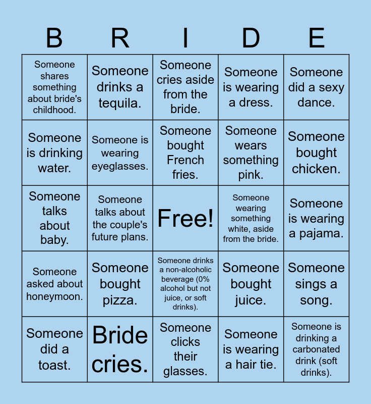 This bingo card has a free space and 27 words: Someone bought juice., Someone is wearing something blue., Someone wears something pink., Someone clicks their glasses., Someone is drinking water., Someone cries aside from the bride., Someone drinks a tequila., Someone asked about honeymoon., Someone wearing something white, aside from the bride., Someone sings a song., Someone talks about baby., Someone is wearing a dress., Someone did a toast., Bride cries., Someone bought chicken., Someone shares something about college days., Someone is wearing eyeglasses., Someone bought French fries., Someone bought pizza., Someone shares something about bride's childhood., Someone is wearing a pajama., Someone is wearing a hair tie., Someone talks about the couple's future plans., Someone is drinking a carbonated drink (soft drinks)., Someone drinks a non-alcoholic beverage (0% alcohol but not juice, or soft drinks)., Someone did a sexy dance. and Someone bought beer..