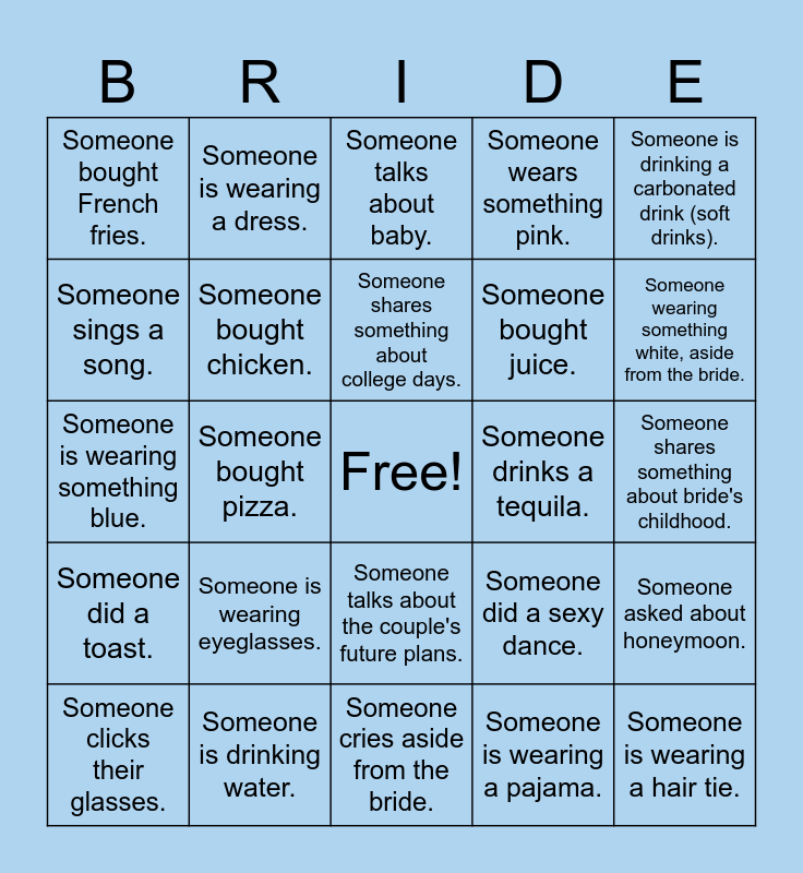 This bingo card has a free space and 27 words: Someone did a sexy dance., Someone bought beer., Someone bought juice., Someone cries aside from the bride., Someone sings a song., Someone talks about baby., Someone is wearing a dress., Someone did a toast., Someone drinks a tequila., Someone asked about honeymoon., Someone is wearing something blue., Someone wears something pink., Someone clicks their glasses., Someone is drinking water., Someone wearing something white, aside from the bride., Bride cries., Someone bought chicken., Someone shares something about college days., Someone is wearing eyeglasses., Someone bought French fries., Someone shares something about bride's childhood., Someone is wearing a pajama., Someone bought pizza., Someone is wearing a hair tie., Someone talks about the couple's future plans., Someone is drinking a carbonated drink (soft drinks). and Someone drinks a non-alcoholic beverage (0% alcohol but not juice, or soft drinks)..