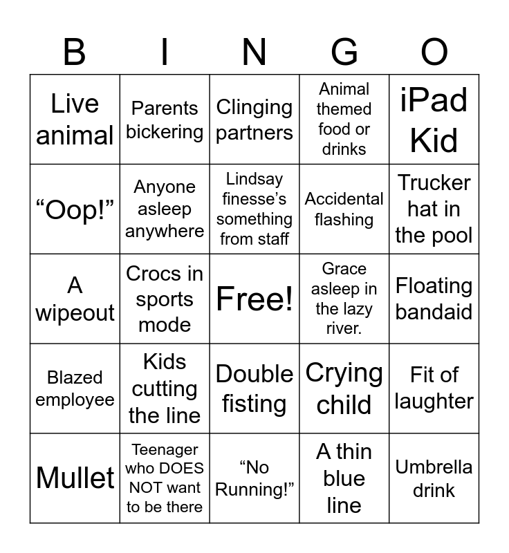 This bingo card has a free space and 24 words: Kids cutting the line, Teenager who DOES NOT want to be there, Lindsay finesse’s something from staff, Mullet, iPad Kid, Live animal, “Oop!”, Parents bickering, Grace asleep in the lazy river., Double fisting, Accidental flashing, A wipeout, Crying child, Fit of laughter, Anyone asleep anywhere, A thin blue line, Floating bandaid, Clinging partners, Trucker hat in the pool, Crocs in sports mode, Umbrella drink, Blazed employee, Animal themed food or drinks and “No Running!”.