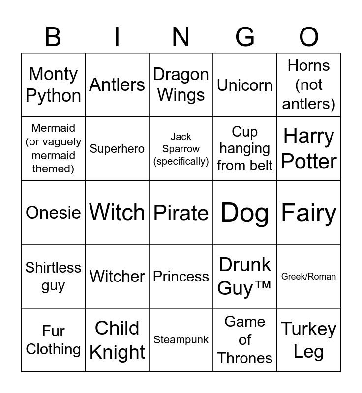 This bingo card has a free space and 48 words: Crying Baby, Turkey Leg, Face paint, Steampunk, Witcher, Crusaders, Antlers, Gandalf, Mermaid (or vaguely mermaid themed), Barefoot, Superhero, Unicorn, Greek/Roman, Drunk Guy™, Someone who thought wearing heels to renfair was a good idea, Corset, Jack Sparrow (specifically), Dog, Puppet, Horns (not antlers), Witch, Game of Thrones, Monty Python, Cup hanging from belt, Orc/goblin, Harry Potter, Fur Clothing, Parasol, Princess, Shirtless guy, Kilt, Monk, Jester, Wizard, Child Knight, Legend of Zelda Shield, Mushroom Hat, Fairy, Plague Doctor, Assassins Creed, Furry, Flower Crown, Dragon Wings, Star Wars, Onesie, Butterfly, Unrelated to Renfair Cosplay and Shrek.