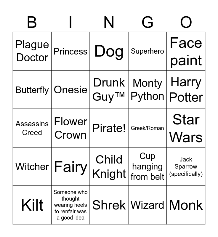 This bingo card has a free space and 48 words: Mushroom Hat, Monk, Unicorn, Shrek, Fairy, Puppet, Princess, Barefoot, Butterfly, Unrelated to Renfair Cosplay, Onesie, Superhero, Jack Sparrow (specifically), Cup hanging from belt, Furry, Crusaders, Drunk Guy™, Greek/Roman, Orc/goblin, Face paint, Flower Crown, Wizard, Plague Doctor, Monty Python, Game of Thrones, Harry Potter, Kilt, Gandalf, Child Knight, Witcher, Fur Clothing, Shirtless guy, Witch, Parasol, Someone who thought wearing heels to renfair was a good idea, Corset, Dragon Wings, Star Wars, Jester, Crying Baby, Antlers, Horns (not antlers), Dog, Mermaid (or vaguely mermaid themed), Assassins Creed, Legend of Zelda Shield, Turkey Leg and Steampunk.