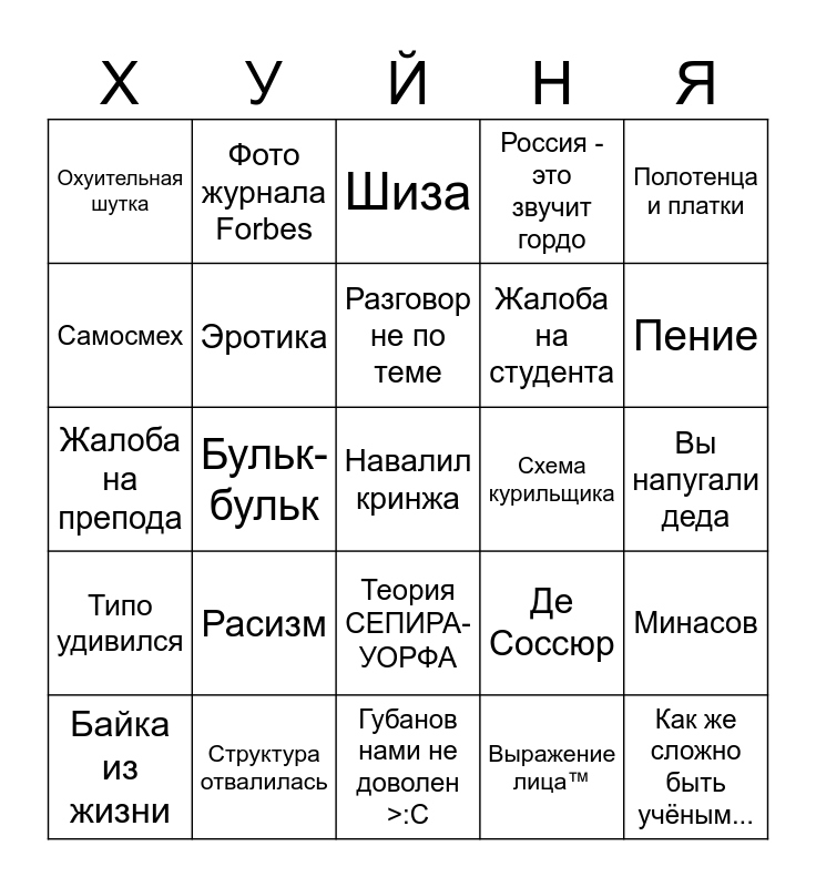 This bingo card has a free space and 24 words: Расизм, Структура отвалилась, Разговор не по теме, Байка из жизни, Полотенца и платки, Охуительная шутка, Самосмех, Фото журнала Forbes, Схема курильщика, Теория СЕПИРА-УОРФА, Жалоба на студента, Жалоба на препода, Де Соссюр, Минасов, Эротика, Выражение лица™, Вы напугали деда, Шиза, Пение, Бульк-бульк, Как же сложно быть учёным..., Типо удивился, Россия - это звучит гордо and Губанов нами не доволен >:C.