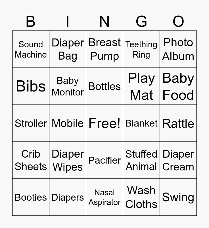 This bingo card has a free space and 35 words: Clothes, Baby Powder, Onesies, Baby Monitor, Pacifier, Teething Ring, Bibs, Burp Cloths, Bottles, High Chair, Stroller, Photo Album, Car Seat, Socks, Sound Machine, Blanket, Wash Cloths, Mobile, Crib Sheets, Swing, Stuffed Animal, Booties, Diaper Cream, Diapers, Breast Pump, Baby Food, Bouncer, Bassinet, Play Mat, Rattle, Swaddle, Nasal Aspirator, Diaper Wipes, Diaper Bag and Diaper Genie.